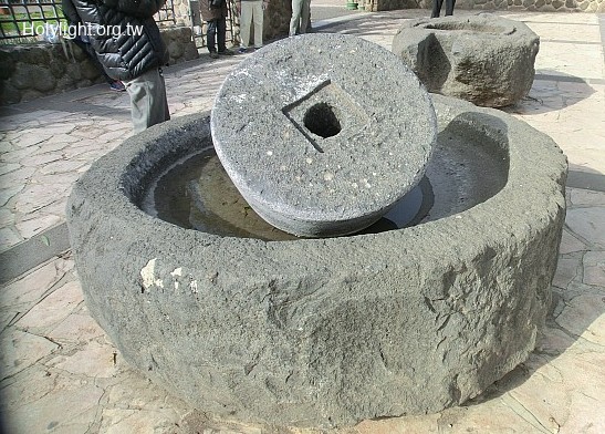 塔加 Tabgha:五餅二魚堂外擺設古代石製壓油器(Ancient Stone Oil Press at the Church of the Multiplication)