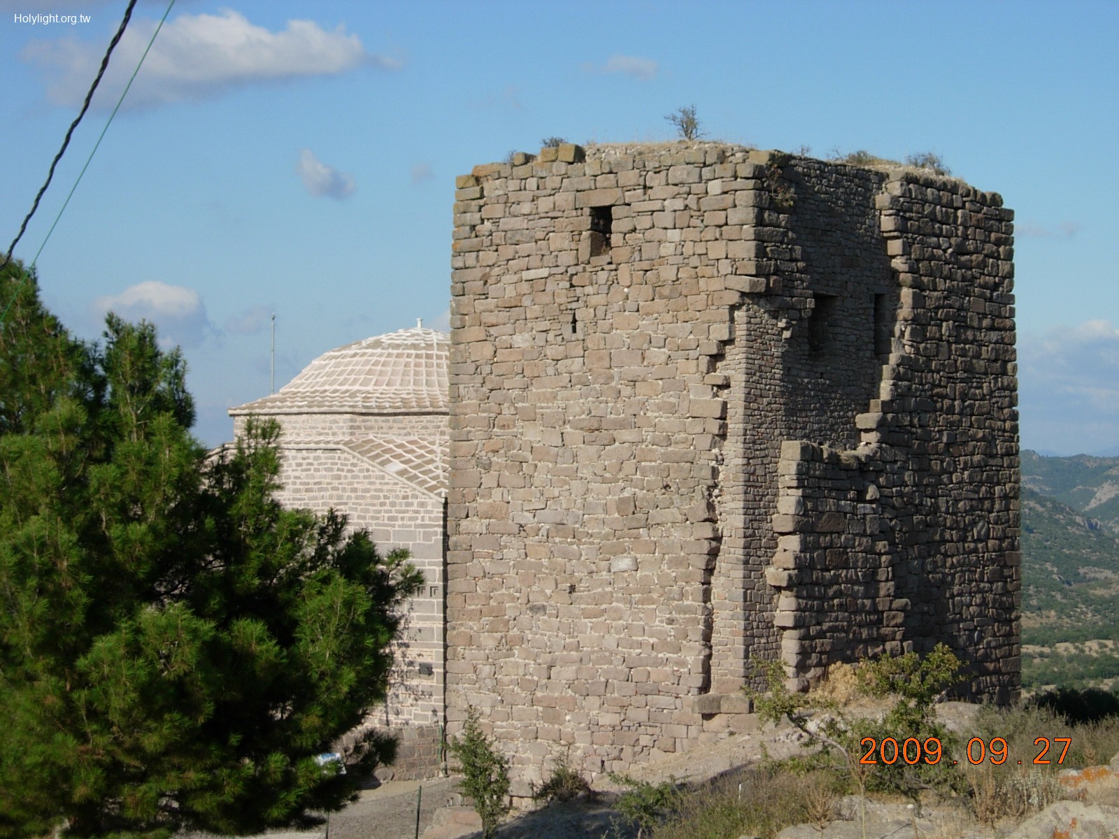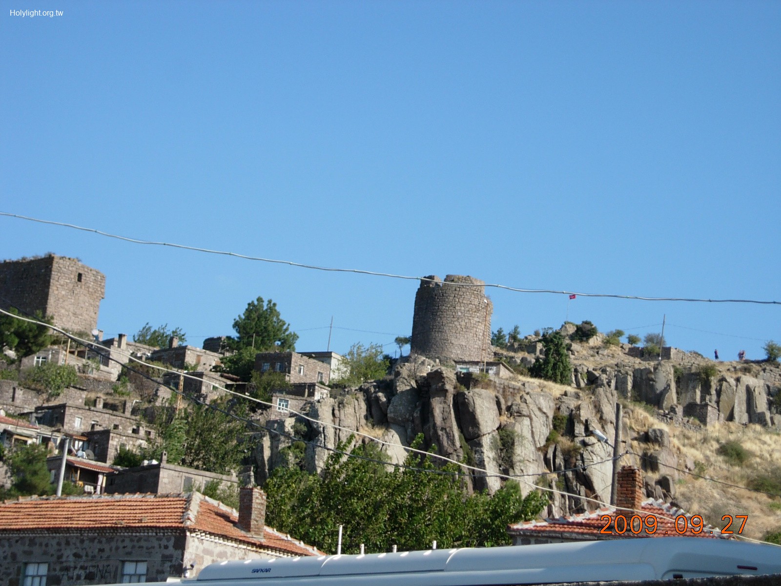 亞朔 Assos, 山上衛城塔樓遺蹟,其後為一古代清真寺(14世紀))