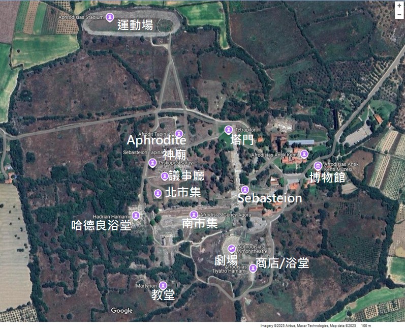 大理石城 Aphrodisias, 考古園區的衛星地圖,位於歌羅西之西約70公里