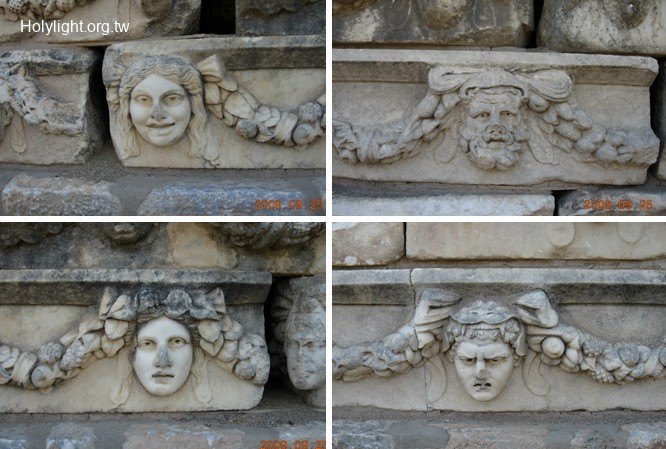 大理石城 Aphrodisias, 不同面具造形的柱廊橫楣石另一景