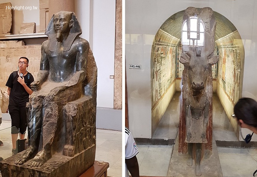 開羅Cairo, 埃及博物館( Egypt Museum) ,左圖為法老Khafra的雕像;右圖為公牛的雕像