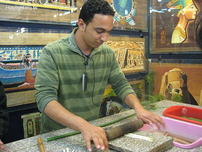 開羅Cairo 吉薩市,把蒲草莖內纖維採出,壓成長片狀