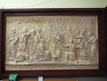迦密山 Mt. Carmel, 迦密會修道院,以利亞求耶和華降火燒盡燔祭的浮雕(王上18:38)(Relief Depicts the Victory of Elijah)