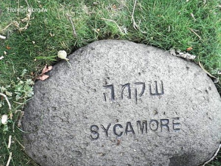 吉諾薩 Ginosar, 阿隆文化中心庭園中刻有樹名的石碑 (Sign for Sycamore Fig Tree in Courtyard of Yigal Allon Center)