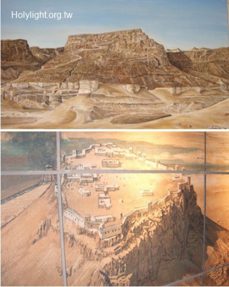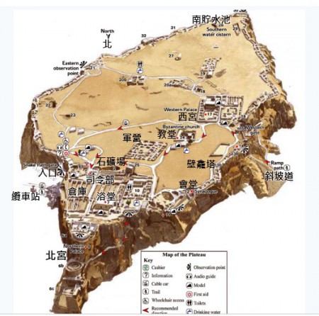 馬撒大 Masada的模型,可見山頂平台(Plateau)四周是懸崖,大希律在此建造堡壘作為行宮
