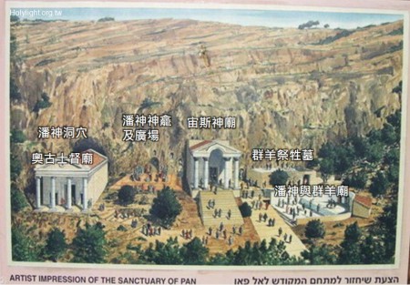 該撒利亞腓立比 Caesarea Philippi, 古代神廟的重構圖,是古代潘神(Pan)及其他神祇的敬拜中心