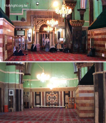 希伯崙 Hebron 列祖墓(Tomb of Patriarchs),清真寺內的景觀,上圖前方有祈禱壁龕,左右兩旁分別為利百加和以撒的衣冠塚