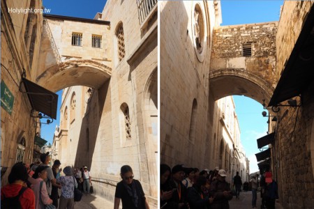 悲苦路Via Dolorosa第2-3站間:Ecce Homo Arch ,哈德良時代的拱門,相傳為彼拉多在此說:你們看這個人!(約19:5)