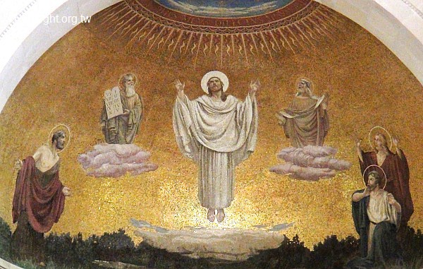 標題 : 他泊山 Mount Tabor, 變像堂內後殿上方有關耶穌變像的馬賽克(太17:3) (Apse Mosaic in Church of the Transfiguration)