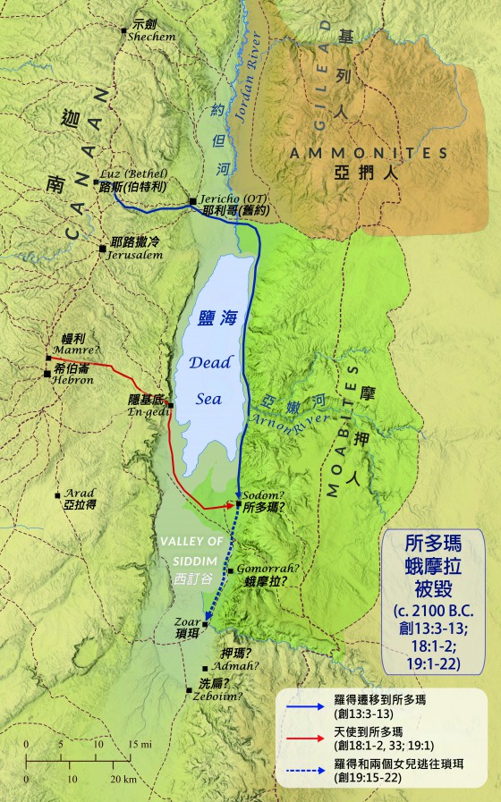 【作者註】:本文假定所多瑪、蛾摩拉和貝拉(瑣珥)分別位於死海南部的Bab edh-Dhra, Numeira, 及Khirbat ash-Sheikh `Isa。基本上是根據: